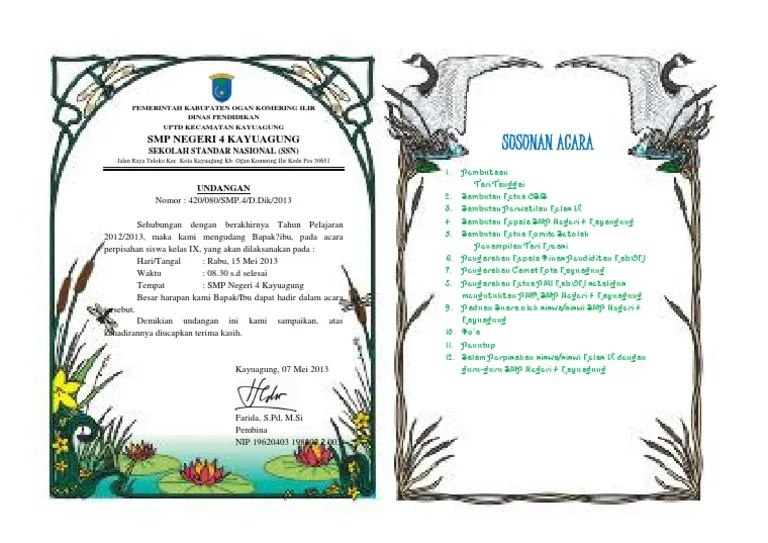 Download undangan perpisahan sekolah format word koleksi undangan, desain undangan contoh, undangan, unik. Mohon maaf apabila banyak kesalahan dalam penulisan artikel . Contoh surat resmi undangan perpisahan sekolah dasar contoh surat Contoh surat undangan rapat resmi formal untuk perusahaan,dinas,rt,karang taruna,sekolah contoh undangan ulang tahun. Contoh surat undangan orang tua perpisahan siswa kelas ix smp 2017 Pidato perpisahan siswa kelas vi. Contoh surat undangan perpisahan sekolah smp contoh surat Contoh susunan acara kenaikan kelas dan acara perpisahan samen sekolah sd smp sma. Contoh surat undangan perpisahan sekolah untuk orang tua wali . Reuni akbar smp negeri 1 bolo tahun 2009. Contoh surat resmi undangan perpisahan sekolah dasar contoh surat. Mulai dari surat resmi sekolah dasar smp dalam bahasa inggris dan lain. Dengan demikian pelaksanaan perpisahan pelepasan siswa kelas 6 sd 9 smp dan kelas 12 sma dapat berlangsung dengan lancar seperti harapan anda .